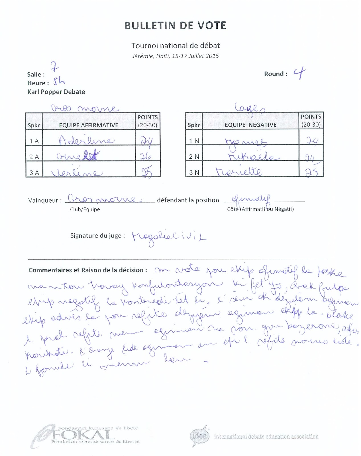de Martissant, Champion du tournoi national de débat Karl Popper 2015, à