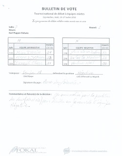 Bulletins de vote des jurys du tournoi de débat à équipes mixtes